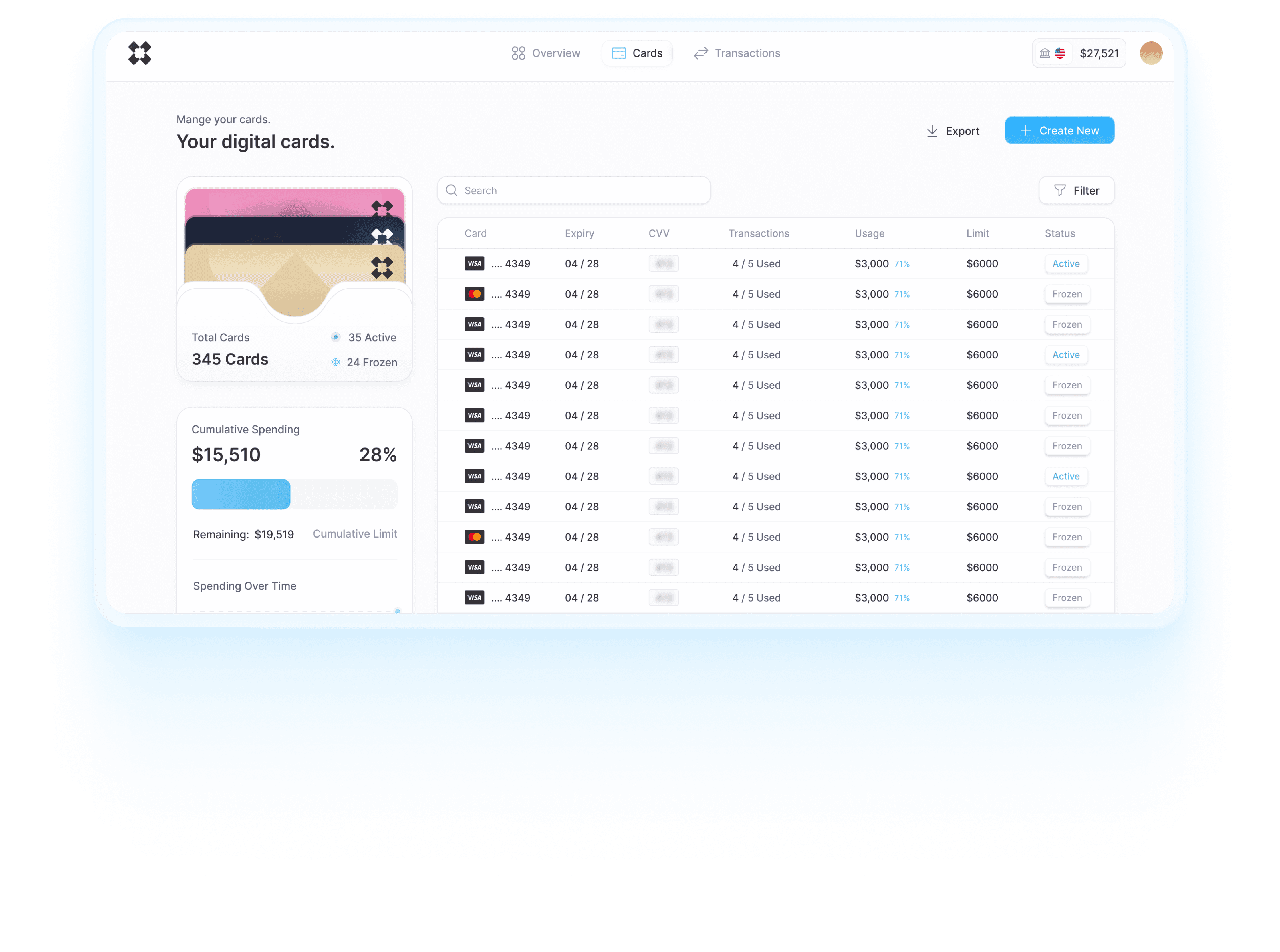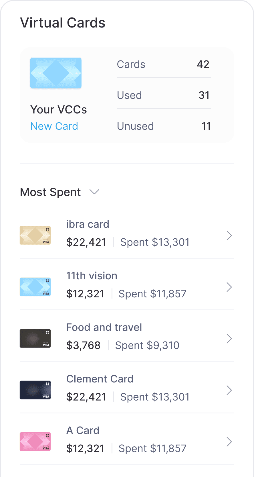 Issue virtual cards instantly, set custom limits, freeze or delete anytime. Gain full visibility across teams and platforms.